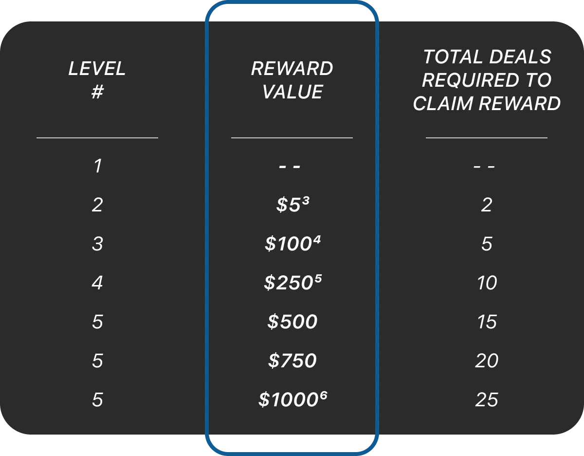 ³ Reward requires completion of one Level 1 and one Level 2 Deals.